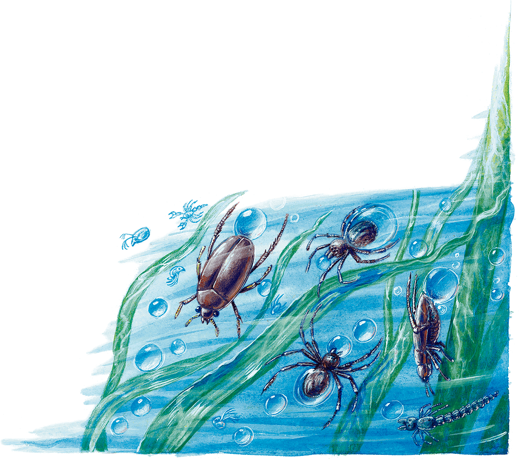 – Воздух паук приносит в свой колокол с поверхности пруда. Он поднимается наверх, выставляет наружу брюшко, покрытое очень тонкими волосками. Эти волоски и хватают воздух. Когда пространство между волосками наполнится воздухом, паук натягивает на брюшко паутину и несёт воздушный баллон к себе в домик. Кстати, со своим воздухом в чемоданах путешествуют под водой и многие водяные жуки.