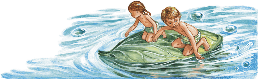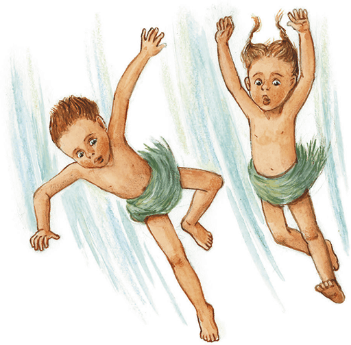 Взмахнув руками и перевернувшись в воздухе, ребята стремительно полетели вниз, в быструю, бурную реку.