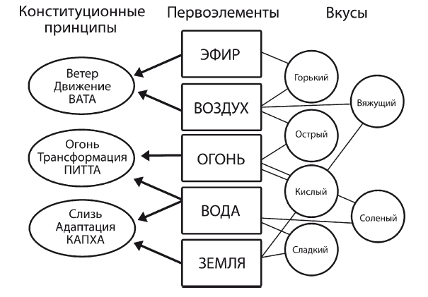 Всё аюрведическое знание базируется на понятии Тридоша – трёх основных составляющих физического тела человека: Вата (газ, воздух), Питта (желчь, огонь) и Капха (слизь, вода). Если описать доши одним словом, то Вата – это движение, Питта – трансформация, а Капха – это стабильность. Сочетание дош в организме человека и даёт его индивидуальный конституциональный тип. Вата-доша отвечает за дыхание, сердцебиение и кровоток, деятельность мышц, нервные импульсы, движение межклеточной и внутриклеточной жидкости, поток питательных веществ и отходов, сенсомоторные функции, естественные позывы. Питта-доши – это температура тела, цвет кожи, блеск, пищеварение, усвоение, понимание и восприятие. Капха – принцип включает в себя все ткани, устойчивость, рост, силу и исцеление, а также иммунитет, сопротивляемость, смазку и увлажнение.