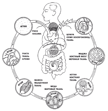 Из первой ткани образуется вторая, из второй третья и так далее до седьмой ткани – шукры. А из шукры образуется восполняемый оджас, или восполняемая жизненная сила. Есть ещё невосполняемый оджас, который мы получаем с рождением. И он зависит от того, насколько правильно нас зачали родители. Таким образом, если произойдёт сбой на каком-то этапе формирования тканей, то изменения коснутся всех остальных дхату. А неправильное питание, которое напрямую связано с первой дхату – расой, отразится на всех остальных тканях.