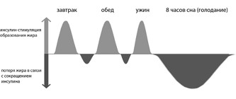 Темно-зеленым показано запасание жира при приеме пищи под действием инсулина. Светло-зеленым – расщепление жира при снижении уровня инсулина в процессе нашей жизнедеятельности (как видите, это происходит даже ночью). Если светло-зеленого больше, чем темно-зеленого, значит, мы худеем.