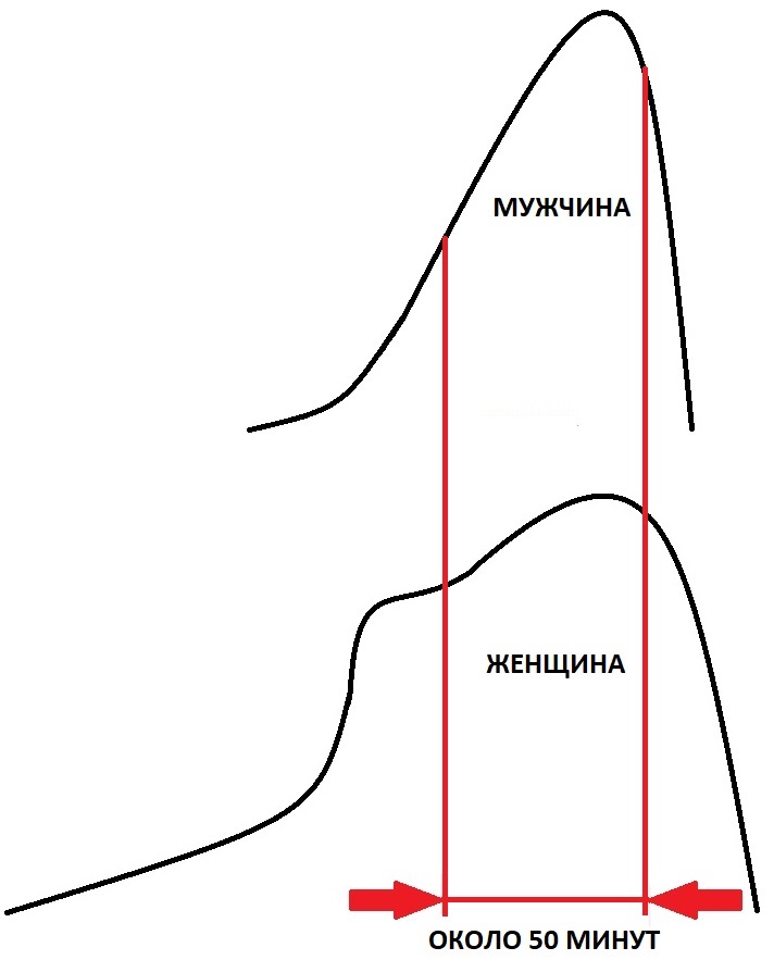 На рисунке приведены кривые развития сексуального возбуждения у мужчины и женщины.