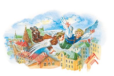 Идут двое мальчишек и разговаривают. Те самые, которые минуту назад высовывали языки, чтобы облизать нос, те самые, которые только что бегали наперегонки с трамваем. А теперь они рассуждают о крыльях для человечества.