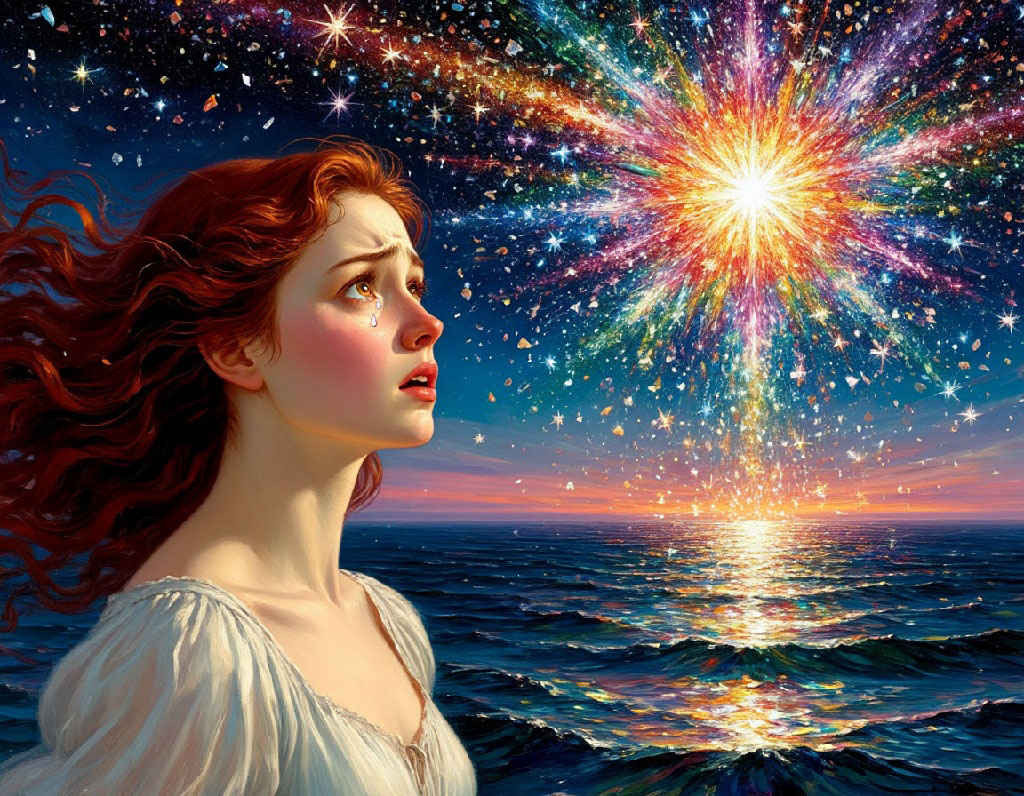 Звезда, словно затаившая дыхание перед последним танцем, начала неспешно распускать свои огненные лепестки, постепенно превращаясь в огромный цветок. И вот, достигнув апогея своего сияния, она вдруг вспыхнула ослепительной вспышкой и рассыпалась на миллионы сверкающих осколков, которые, подобно искрящемуся дождю, устремились во все стороны Вселенной.