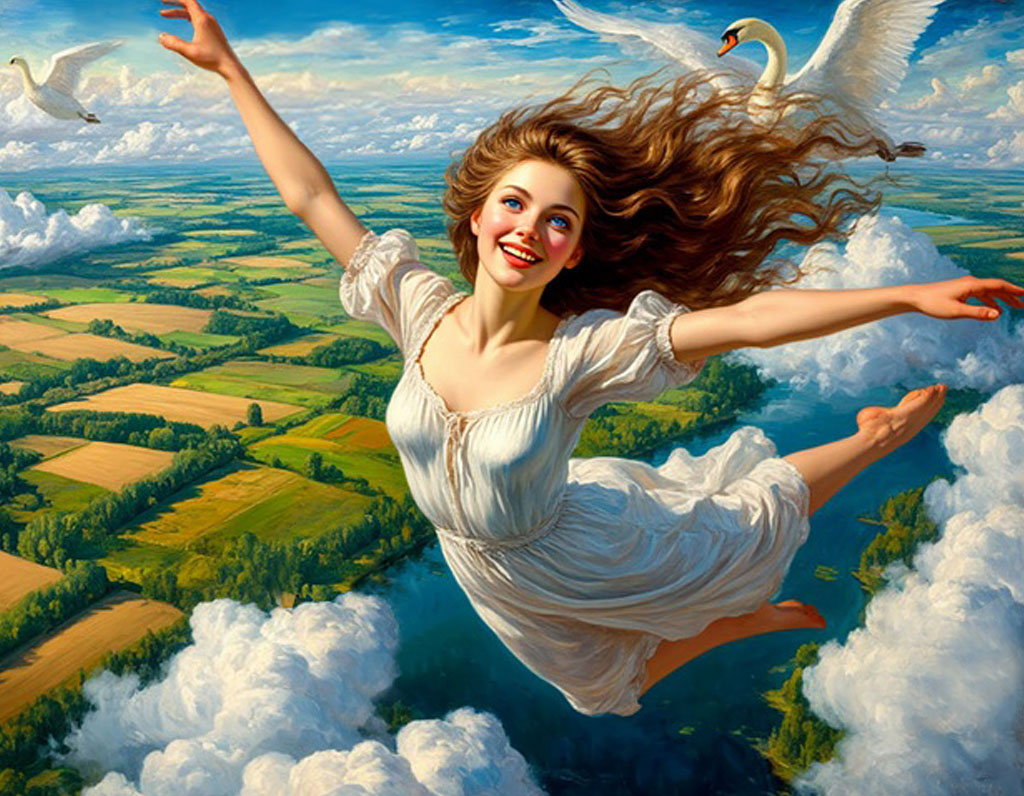 Она была на седьмом небе от счастья в буквальном смысле этого слова. Эмоции переполняли её, и она то разгонялась до невероятной скорости, то мгновенно останавливалась, чтобы перевести дух. Не требовалось никаких усилий, чтобы мгновенно взлететь вверх или резко опуститься вниз. Казалось, что возможностям полёта не было никаких ограничений. Можно было легко подняться выше, чтобы увидеть всю картину целиком, а если что-то конкретное привлекало внимание, то не составляло никакого труда мгновенно спуститься вниз и рассмотреть объект в мельчайших деталях. Перемещение в пространстве не требовало вообще никаких усилий. Ощущение восторга, счастья и радости переполняли всё её существо. Оказавшись на высоте птичьего полёта, она была поражена невероятной красотой открывшегося пейзажа. Поля, луга, перелески и озёра, освещённые солнечными лучами, представляли собой картину невиданной красоты.