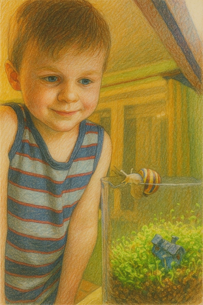 Счастью моему не было предела. Я взял улитку и бережно нёс её в руке, боясь уронить или повредить панцирь. По дороге домой мы собрали всё необходимое для обустройства уютного жилища для Ули – так я назвал нашу гостью.