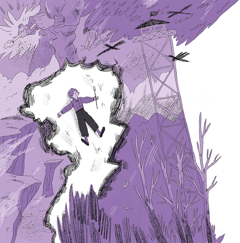 Она видела незнакомый скалистый пейзаж, высокую зелёную траву и побережье моря. На скалах стояла пожарная вышка, а под ними из земли торчала знакомая белая палка. Кто-то спускался вниз по скалам, и при их приближении посох вспыхнул и исчез.