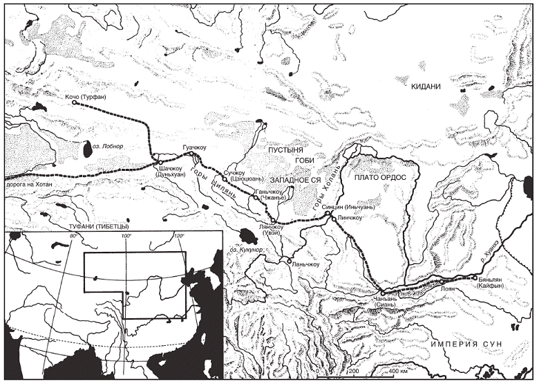 К западу от сунского гарнизона располагались четыре штаба Западной армии и территория Улян, которая была освоена еще в пору правления У-ди[21] и служила коридором, связывающим Китай с Центральной Азией. Со времен императоров династии Хань Китай управлял западными землями из этой приграничной крепости. Затем, много лет назад, ставку военачальника, контролировавшего Улян, перенесли в Лянчжоу,[22] а когда в Шачжоу[23] было организовано китайское наместничество, все полномочия отошли к тамошнему правителю. В обоих случаях Улян находился под властью Поднебесной. Позднее эту землю занимали попеременно туфани и уйгуры, и она уже больше не принадлежала Китаю. К 1027 году отдельные племена объединились в маленькие царства. Больше всего своим могуществом гордилось государство тангутов, чей главный гарнизон располагался в Синцине.[24] В Лянчжоу хозяйничали туфани, в Ганьчжоу[25] – уйгуры, а Шачжоу удерживали ханьцы.
