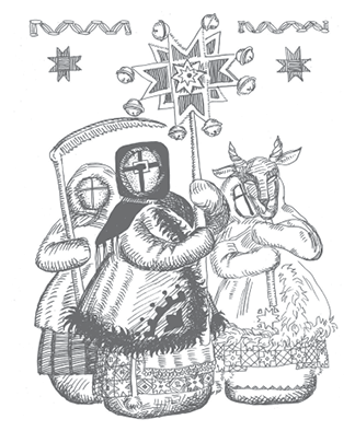 Во время Коляды не только гадают и совершают обряды, но и ходят по соседям с веселыми песнями (колядками). Группу колядующих называли ряжеными, потому что они облачались в маски животных, рога, уши и звериные накидки. Частыми образами были медведь, волк, коза, старуха, леший, мавка. Переодевались для того, чтобы отдать дань уважения почитаемым богам, животным и существам. Будто бы не люди, а сами духи ходят по домам и благословляют хозяев на хороший урожай и счастливый год. Те, к кому пришли ряженые, обязательно угощали их пряниками/печеньем, именуемым козулями, или давали нечто съестное. Хорошая традиция на Коляду – готовить много еды, ведь ее обилие обеспечивает и обилие на весь год. Таким образом происходила магия «первого дня».