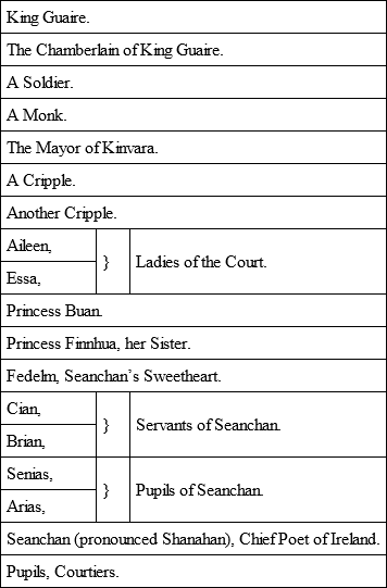 And my nephew said, there are a good many plays to be played for you, some to-night and some on other nights through the winter, and the most of them are simple enough, and tell out their story to the end. But as to the big play you are to see to-night, my nephew taught me to say what the poet had taught him to say about it. [Puts down candlestick and puts right finger on left thumb.] First, he who told the story of Seanchan on King Guaire’s threshold long ago in the old books told it wrongly, for he was a friend of the king, or maybe afraid of the king, and so he put the king in the right. But he that tells the story now, being a poet, has put the poet in the right.