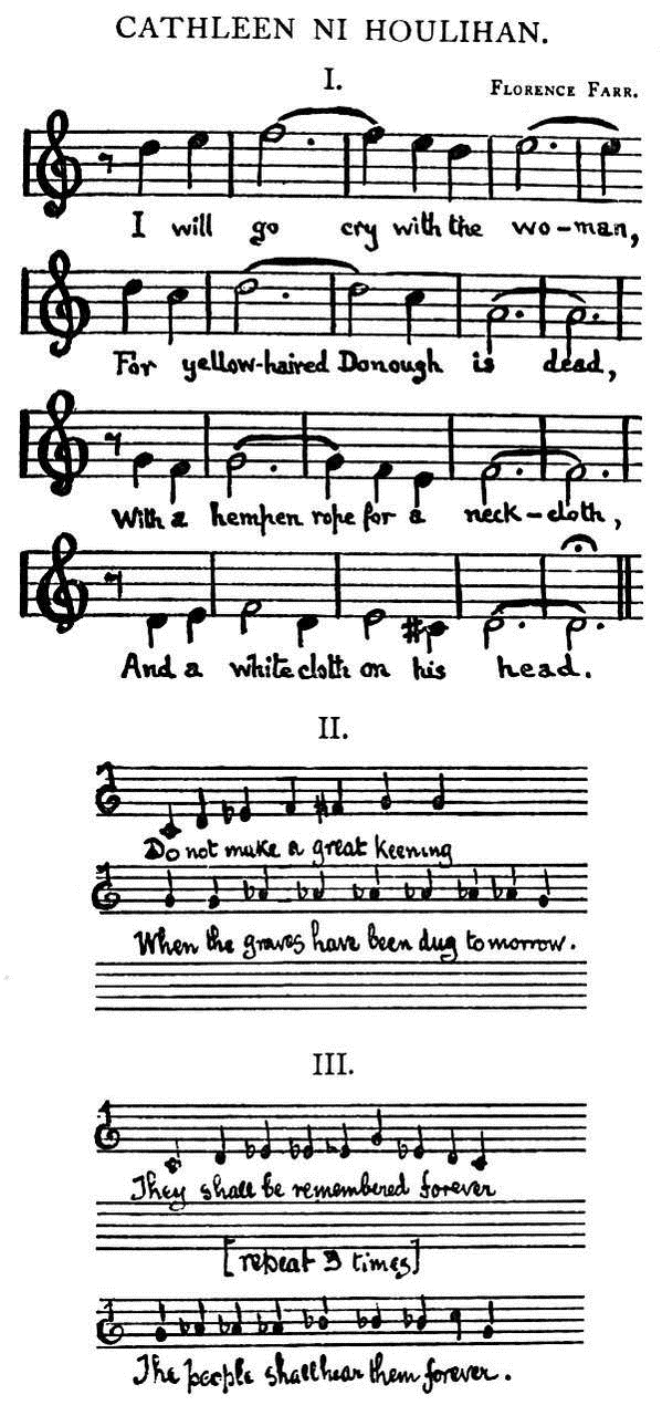 All the music that is printed here, with the exception of Mr. Arthur Darley’s, is of that kind which I have described in Samhain and in Ideas of Good and Evil. Some of it is old Irish music made when all songs were but heightened speech, and some of it composed by modern musicians is none the less to be associated with words that must never lose the intonation of passionate speech. No vowel must ever be prolonged unnaturally, no word of mine must ever change into a mere musical note, no singer of my words must ever cease to be a man and become an instrument.