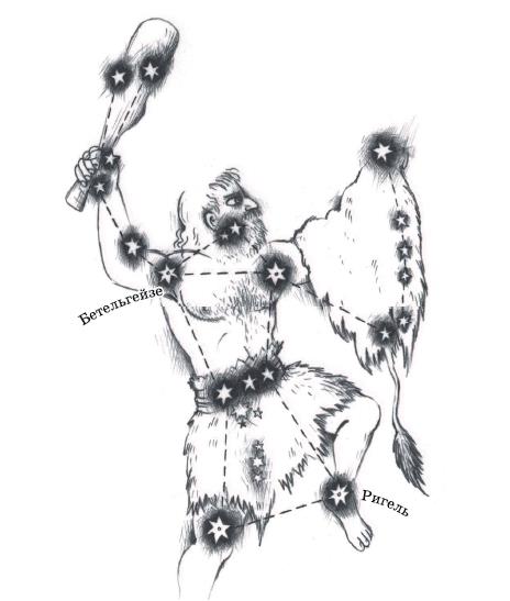 Если весной в ясную звездную ночь смотреть от Штарнбергского озера на юг, в сторону Альп, то слева можно увидеть большое созвездие, которое сразу бросается в глаза, это Орион (рис. 1)[2]. Понаблюдав за ним подольше, замечаешь, что он не стоит на месте, а странствует всю ночь: восходит, достигает своей высшей точки – кульминации, потом снова заходит. Но виден он всегда в южной части небосклона. Середину звездной фигуры украшает пояс из трех ярких звезд и трех звезд поменьше, замыкают контур состоящие из двух звезд «ступни» и «плечи». Это созвездие было известно еще в Древнем Вавилоне: его называли Небесным Пастухом, Охотником, Богом Большой Двери. Кажется, будто Орион всегда стоит над горизонтом, огромный и несгибаемый; потому он так заметен. Он проделывает небольшой путь, словно поднимаясь на воображаемую гору, – всегда с востока на запад, но никогда не удаляется слишком далеко от горизонта. Благодаря этому его так легко запомнить.
