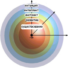 Можно создать неограниченное количество сфер Сознания. Люди знают и могут описать некоторые из этих сфер: существование, рост, инстинкт, интеллект и интуиция. Визуально эти сферы Сознания можно представить так, как показано на рисунке ниже.