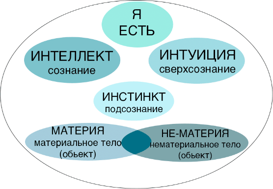 разум, который состоит из интуиции, интеллекта и инстинкта – довольно сложная структура под названием «тело», которая на самом деле состоит из материального (физического) тела и многих других элементов, также называемых «телами» (детали не важны в данном описании),