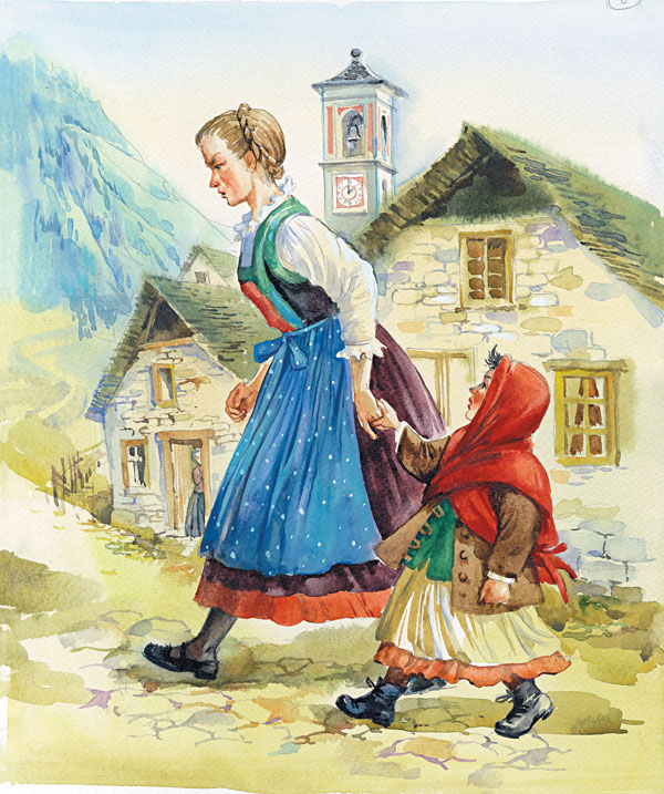 По этой узкой горной тропе поднималась в предгорья ясным июньским утром рослая и крепкая девушка, ведя за руку ребёнка, щёки которого пылали так, что румянец пробивался даже сквозь тёмный загар. И неудивительно: ребёнок, несмотря на жаркое летнее солнце, был так закутан, будто ему предстояло выйти на лютый мороз. С виду девчушка не доросла и до пяти лет; о комплекции её судить было трудно, поскольку на неё надели две, если не три одёжки, а поверх одёжек ещё крест-накрест обвязали большим красным платком, так что она представляла собой бесформенную груду, которую воткнули в два тяжёлых, подбитых гвоздями башмака и заставили карабкаться в гору, пыхтя и полыхая жаром. Они уже с час шагали из долины в гору, когда добрались до деревушки, что располагалась на полпути до горных пастбищ – альма – и так и называлась: Деревушка. Тут идущих стали окликать едва ли не из каждого двора – то из окна, то из дверей, а то с дороги, ведь девушка пришла в своё родное селение. Однако же она нигде не замедлялась, на ходу отвечая на приветствия и вопросы, и не остановилась, пока не дошагала до последнего домика на отшибе. Тут ей крикнули из дверей: