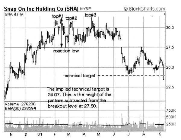 После того, как у рынка исчез интерес к технологическим новшествам в начале 2000 года, инвесторы занялись поиском новых идей и концепций. Компания Snap-On Tools (SNA) представляет собой фирму с хорошей репутацией, солидным ростом и прекрасным менеджментом. К 2 февраля 2001 года ее акции поднялись на слухах о хороших прибылях до значения $30.93 (вершина 1) с ценового уровня в $21, на котором они находились 19 октября 2000 года. Именно 2 февраля компания опубликовала пресс-релиз, в котором высказала уверенность в рекордно высоких прибылях, несмотря на замедление темпов экономического роста в стране. Но инвесторы предпочли продать акции на этих позитивных новостях, и к 23 февраля цена была уже на отметке $27.50. Это реакционное дно оказалось довольно важным, поскольку вскоре начался новый подъем, и 9 марта цена достигла значения $30.94 (вершина 2). Во время второго подъема цены к уровню сопротивления объемы торгов сократились. Но уже совсем скоро акция вновь была на уровне поддержки $27.50. С 28 марта начался последний, довольно слабый рост акций Snap-On Tools к обозначенным вершинам, причем на фоне слабых объемов. 18 апреля цена достигла значения $31.28 за акцию (вершина 3), но закрылась в этот день ниже – на уровне $30.90. После этого началось ее серьезное падение. Формирование тройной вершины полностью завершилось спустя почти два месяца. 18 июня цена открытия торгов по Snap-On Tools оказалась ниже уровня поддержки $27.50.