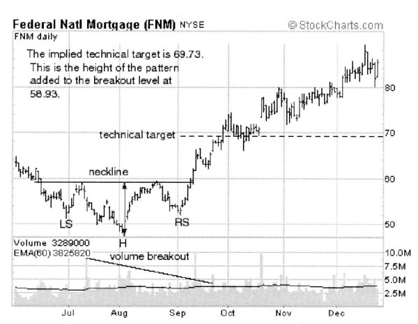 В очередной раз на рынок вернулись покупатели, и акция, поменяв направление движения, поползла вверх, быстро добравшись до реакционного пика на уровне $59.00. Этот подъем завершил формирование головы модели, но, в то же время, спровоцировал активность медведей. К сентябрю цена откатилась к значению $52 при слабых объемах, а затем опять, уже в третий раз, поднялась до уровня сопротивления $59. Это случилось после выхода новостей о тщетности попыток ослабить Fannie Mae на юридическом поле. Третий подъем цены к уровню сопротивления оказался успешным, он был пробит, и через 4 месяца цена находилась у отметки $88 (позже она упала и стабилизировалась в районе $65, где и провела больше года).