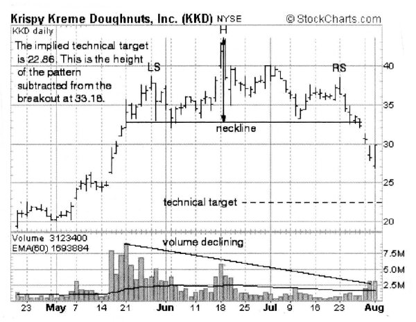 Цена немедленно приступила к спуску и вскоре вновь оказалась на уровне $33 (11 июля). Это завершило формирование головы (head). 12 июля акции Krispy Kreme в очередной раз стали расти в цене. 23 июля ее акции продавались по $38.38, но объемы были ниже, нежели в двух предыдущих подъемах. Рост был обречен на неудачу, и к 25 июля цена откатилась на уровень $33, что привело к завершению формирования правого плеча. Спустя всего лишь несколько сессий цена акции упала к отметке $26.93.