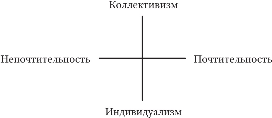 Социально-экономическая плоскостьУ социального пространства современной политики есть по меньшей мере три принципиально важных измерения: государства, рынки и социальное структурирование61. Первые два – это хорошо известные и наиболее заметные институциональные комплексы. Третье измерение может потребовать некоторых разъяснений. Оно отсылает к формированию социальных акторов – процессу, на который, конечно, оказывают влияние государства и рынки, но с дополнительной собственной силой, почерпнутой из форм получения заработка и места проживания, религий и семейных институтов. Оно включает не только классовую структуру, но и на более фундаментальном уровне изображение изменчивой «классовости». Возможно, будет полезно обратиться к более абстрактному, аналитическому различению социального структурирования, чем к конвенциональным измерениям масштаба класса или его силы, или даже от таких категорических идентичностей, как класс, гендер, этничность. Социальные структуры, на которые я хочу обратить внимание, являются не просто структурными категориями, но социокультурными понятиями, с акцентом на широкие, социально детерминированные культурные ориентации. В качестве ключевых характеристик я предлагаю здесь непочтительность/почтительность и коллективизм/индивидуализм (рис. 1.1).