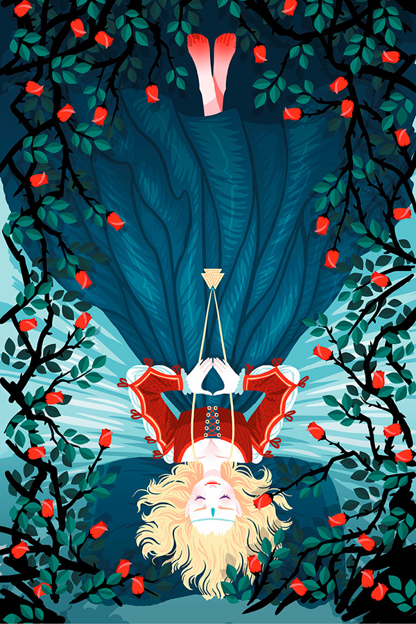 Опечалившись, король с королевой приказали перенести принцессу в опочивальню в самой высокой башне. Добрые феи вернулись и погрузили в сон весь замок. Целых сто лет обитатели замка спали, а вокруг него разрастались деревья и кусты, пока в это сонное царство наконец не попал отважный юный принц.