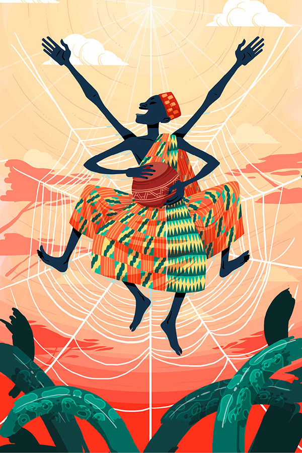 Ананси – плутоватый паук, который вечно попадает в невероятные переделки. Про его шалости ходит множество рассказов, один из самых известных называется «Ананси и все истории мира».