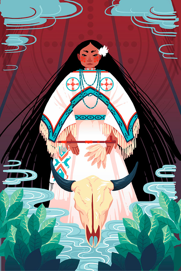 Много-много лет назад на земле не было животных, и индейцы племени лакота голодали. Вождь отправлял охотников все дальше и дальше, и вот однажды двое из них встретили прекрасную молодую женщину в белой бизоньей шкуре. Красавица не подошла к ним, а будто бы подплыла по воздуху, отчего один из охотников догадался, что перед ними не просто смертная женщина, а посланница небес и обращаться с ней надо почтительно. Второй охотник попросту воспылал страстью к красавице. Он самоуверенно подошел к ней и начал грубо заигрывать, намереваясь взять ее в жены.