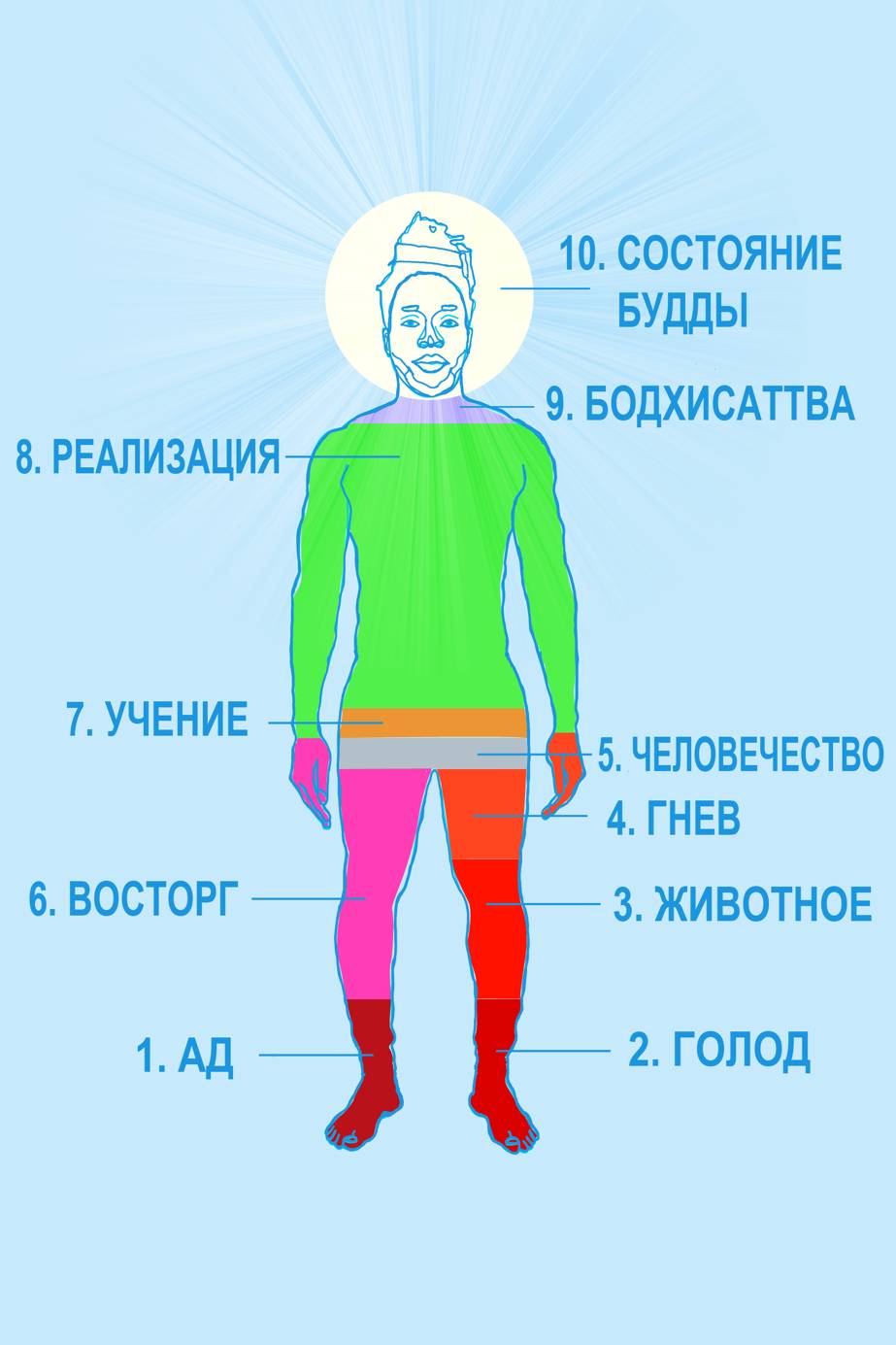Душа – это наша жизнь. Душа – это энергия, которая дает жизнь нашему физическому телу. Энергия также известна как чакра4. Быть полным энергии в душе означает иметь полные чакры в душе. Разные части нашей души – это наши чакры. Все чакры вместе составляют душу. Всего имеется десять чакр. Ничирен Дайшонин объяснил это, используя Десять Миров: Ад, Голод, Животное, Гнев, Человечество, Восторг (Счастье), Учение, Реализация, Бодхисаттва и Состояние Будды. Вы можете прочитать о Десяти Мирах в трудах5 Ничирена Дайшонина.