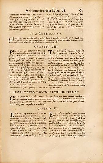 After this picture follows the image of a page from Diophantus' “Arithmetic” with the text of the Fermat’s Last Theorem, published in 1670, and from here immediately the main theme appears.