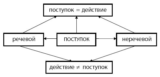 Итоги наших рассуждений были представлены на схеме 9, где показано, что неречевой и речевой поступки являются действиями, однако не каждое действие становится речевым поступком, следовательно, чаще мы совершаем действия, в том числе и речевые, и реже – поступки.