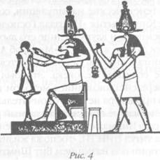 Египетские художники, подобно своим предшественникам шумерам, тоже изобразили момент первой встречи человека и бога (рис. 4) – Хнему держит сотворенное им существо, а ему помогает сын Тот (бог научных знаний и медицины).