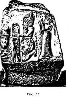 Этот анализ атрибутов Нисабы поможет нам идентифицировать богиню – будем называть ее богиней астрономов, – изображенную на ассирийской табличке (рис. 80). Она стоит в проеме ворот, увенчанных ступенями для наблюдений. Богиня держит в руке прибор в виде серпа, укрепленного на шесте, – для наблюдения за движением Луны с целью ведения календаря. На то, что это Нисаба, указывают и четыре звезды, являющиеся, по нашему убеждению, символом этой богини.
