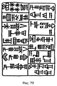Термин МУЛ, который в шумерском языке обозначал «небесное тело» (в аккадском языке Каккаб), применялся как к звездам, так и к планетам, и поэтому остается только гадать, что было изображено на карте звездного неба Нисабы: звезды, планеты или оба вида небесных тел. Первая строчка текста, представленного на рис. 79, содержит восхваление Нисабы как великого астронома, где она называется эпитетом НИН МУЛ.МУЛ.ЛА – «Госпожа множества звезд». Любопытная особенность этой формулировки заключается в том, что выражение «множество звезд» написано при помощи четырех значков, обозначающих звезду, а не сочетанием значка «много» со значком «звезда». Единственным логичным объяснением этой необычной формулировки может быть предположение, что Нисаба на своей звездной карте могла указать четыре звезды, которые мы используем и в наше время для определения сторон света.