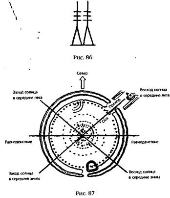 Шесть расположенных по окружности точек и одна в центре образуют такую же схему (рис. 87), как Стоунхендж II – построенный примерно в то же время, – и обеспечивают ориентировку не только на точки равноденствия, но и на точки солнцестояния (восход и заход солнца в середине лета и середине зимы). Поскольку наступление нового года в Месопотамии было жестко привязано к точкам равноденствия, в результате чего краеугольный камень зиккуратов был обращен к востоку, установка каменных колонн, позволявших ориентироваться на точки солнцестояния, представляла собой серьезное новшество. Это было явно «египетское» влияние, поскольку связанная с точками солнцестояния ориентация была отличительной особенностью именно храмов Египта – как раз в эпоху Гудеа.