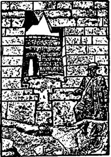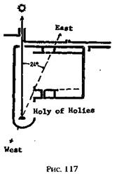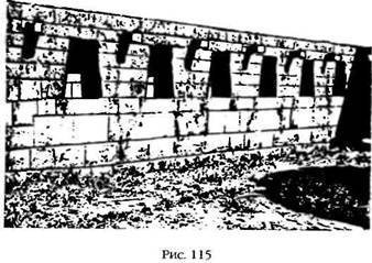 Два окна в полукруглой стене своей трапецеидальной формой (широкие внизу и зауженные вверху) напоминают знаменитые Три Окна на Священной Площади, копируя, таким образом, форму и функции окон эпохи мегалита. Сходство усиливается еще и тем, что идеальная кладка из тесаных камней в том месте, где кончается закругление и начинается северная прямая стена, имеет третье окно – если так можно назвать это отверстие. Оно больше первых двух и тоже не прямоугольное. Форма его напоминает перевернутую лестницу, а верхняя часть образована не прямой перекладиной, а имеет клинообразный вырез, похожий на перевернутую букву V (рис. 114).