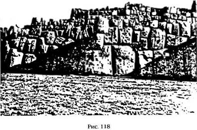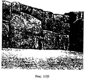 Этот выступ имеет форму треугольника, обращенного широким основанием к горной гряде, частью которой он является; две его стороны образованы глубокими ущельями, а вершина представляет собой крутой пик, поднимающийся на высоту восьмисот футов над лежащим у его подножья городом. Плато можно условно разделить на три части. Самая широкая часть образует основание треугольника, и на ней преобладают выступы скальных пород, кем-то – согласно местным легендам, это были «гиганты» – тщательно обработанные, причем легкость, с которой это было сделано, а также, углы обработки исключают любые ручные орудия. Мы видим гигантские ступени, площадки, «перевернутые» лестницы, а также прорезанные в скалах извилистые каналы, туннели, желоба и ниши. Средняя секция выступа представляет собой площадку длиной и шириной несколько сот футов, которая была специально выровнена, в результате чего получилось огромное плоское пространство. Эта ровная площадка отделена от треугольной и более высокой вершины выступа удивительным и уникальным каменным сооружением. Оно состоит из трех мощных зигзагообразных стен, протянувшихся параллельно друг другу от одного края выступа до другого (рис. 118). Стены возведены таким образом, что одна возвышается над другой на общую высоту около шестидесяти футов. Они сложены из колоссальных каменных блоков полигональной формы, что указывает на эпоху мегалита; самые крупные из них – это передние блоки, которые держат земляные насыпи, служащие основанием второго и третьего ярусов. Самые маленькие камни весят от десяти до двадцати тонн; размеры большинства блоков достигают пяти футов в высоту, а толщина и ширина их составляет от десяти до четырнадцати футов. Многие блоки гораздо крупнее: высота одного из мегалитов первого ряда достигает двадцати семи футов, а весит он более трехсот тонн (рис. 119)-Подобно мегалитам в Мачу-Пикчу, гигантские блоки Саксахуамана привезены издалека. Затем их обтесали, отполировали и поставили на место таким образом, что они прочно держатся без всякого раствора.