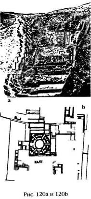 Однако это не единственная круглая структура на выступе. Предположив, что три яруса гигантских стен представляли собой крепость, испанцы считали само собой разумеющимся, что руины на самой высокой и узкой части выступа – позади и выше стен – относились к фортификационным сооружениям инков. Легенды рассказывали о том, как однажды в одно из отверстий на вершине упал ребенок, а затем появился в нескольких сотнях футов ниже, в самом Куско. Поэтому местные археологи начали проводить раскопки, хотя и ограниченные. Они обнаружили, что местность, расположенная за тремя каменными стенами и выше их, буквально пронизана подземными туннелями и камерами. Однако еще более важной была находка фундаментов ряда примыкающих друг к другу квадратных и прямоугольных строений (рис. 120а), в самом центре которых располагалась структура в виде правильного круга. Местное население называет эти руины «Круглое здание», а археологи дали ей название Торреон, или Башня, – такое же, как у полукруглого сооружения в Мачу-Пикчу, – и предположили, что это была оборонительная башня, часть «крепости» Саксахуаман.