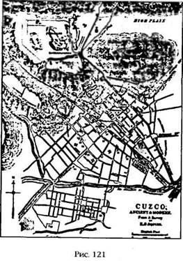 Когда в 1533 году испанские завоеватели дошли до столицы инков Куско, они с удивлением обнаружили крупный город, в котором около 100 тысяч жилых домов окружали религиозный и государственный центр, состоявший из величественных дворцов, храмов, площадей, парков, рынков и плацев. Они были изумлены, услышав, что город разделен на двенадцать районов, границы которых проходили по линиям между сторожевыми башнями, построенными на окружавших город горных вершинах (рис. 116). Конкистадоры с восхищением взирали на главный храм города и всей империи – не из-за его совершенной архитектуры, а из-за того, что он был буквально одет в золото. Оправдывая свое название, Кориканча, что означает «золотая ограда», храм был облицован золотыми пластинами; внутри хранилась удивительная утварь, а также фигуры птиц и зверей, сделанные из золота, серебра и драгоценных камней. Во дворе храма был устроен сад, все растения в котором были искусственными, изготовленными из золота и серебра. Только первый разведывательный отряд испанцев снял со стен и увез с собой семьсот золотых пластин (не говоря уже о множестве других ценных предметов).