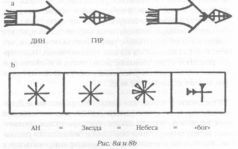 Утверждение о том, что Южная Месопотамия и Древний Шумер и есть тот самый ЭДИН, или библейский Эдем, не просто устанавливает географическое соответствие между шумерскими текстами и библейским рассказом. Мы получаем возможность идентифицировать тех, с кем встречались представители человечества. ЭДИН – это дом («Э») справедливых («ДИН»). Полное название этих существ, ДИН.ГИР, означает «справедливые из огненных ракет» и пиктографически изображается в виде двухступенчатой ракеты, командный отсек которой может отделяться для спуска на поверхность планеты (рис. 8а). По мере того как пиктограммы трансформировались в клинописный шрифт, этот значок сменился символом звезды, имевшим значение «божественные»; впоследствии, в Ассирии и Вавилоне, символ еще больше упростился, превратившись в скрещенные клинья (рис. 8b), и на аккадском языке стал читаться как «илу» – «высокие».