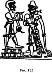Время, о котором шла речь – это становится ясно из спора между Нергалом и Мардуком, – это неизбежная смена Зодиака, то есть наступление Нового Века. Мардук принял брата в Е.САГ.ИЛ, храме-зиккурате Вавилона. Встреча произошла в священной комнате, которая называлась ШУ.АН.НА, «Высшее небесное место», которое Мардук, очевидно, считал самым подходящим для дискуссии. Он был уверен, что время уже пришло, и даже показал Нергалу инструменты, которые он использовал для доказательства этого. (Вавилонский художник, изобразивший встречу двух братьев, нарисовал Нергала с входящим в его атрибуты оружием, а Мардука – в шлеме, на вершине своего зиккурата с неким устройством в руках (рис. 153), которое очень похоже на приборы для наблюдений, использовавшиеся в Египте в храмах Мина.)