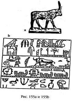 С самого зарождения египетских династий и религии высшей похвалой великим богам в Египте считалось сравнение их с Небесным Быком. Его земному символу, священному быку Апису (рис. 155а), поклонялись в Гелиополисе и Мемфисе. На некоторых самых древних пиктограммах – таких древних, что сэр Флиндерс Петри («Royal Tombs») относил их к периоду «нулевой династии», – символ Священного Быка изображен на Небесной Лодке, рядом с которой стоит жрец, держащий в руках ритуальные принадлежности (рис. 155b). (Среди рисунков на этой древней табличке, а также на другой, похожей на нее, на которую также ссылается сэр Флиндерс Петри, есть изображение сфинкса, и это неопровержимо доказывает, что сфинкс существовал еще до его предполагаемого сооружения фараоном Четвертой династии Хефреном.) Для быка Аписа в Мемфисе был построен лабиринт – как впоследствии для Минотавра на Крите. В Саккаре в нишах гробницы фараона Второй династии были найдены глиняные головы быков с натуральными рогами; известно также, что фараон Третьей династии Джосер в своей просторной пирамиде в Саккаре проводил специальные церемонии в честь Небесного Быка. Все это происходило во времена Древнего Царства, периода, окончившегося примерно в 2180 году до нашей эры.