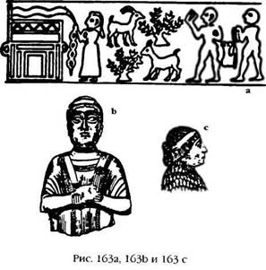 Примечательно, что даже на самых древних шумерских рисунках, изображающих мужчин обнаженными, женщины всегда одеты (например, рис. 163а); исключения составляли лишь изображения соития, где и мужчины, и женщины обнажены. Со временем одежда и прически женщин становились все более сложными и изысканными (рис. 163б, 163с), отражая их статус, образование и знатность. Ученые, занимающиеся анализом этих аспектов древних цивилизаций Ближнего Востока, отметили, что на протяжении двух тысяч лет господства шумеров было создано множество отдельных рисунков и скульптур с изображением женщин – археологами обнаружены сотни портретных изображений – тогда как в период вавилонской империи такие изображения практически отсутствовали.