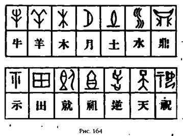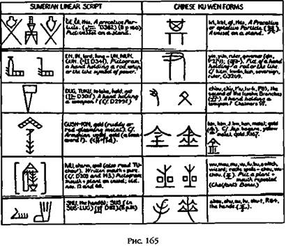 Введенная в стране письменность была моносиллабической, а шрифт пиктографическим (из нее развились знакомые китайские иероглифы, представляющие собой некую разновидность «клинописи», рис. 164). Все это характерные особенности шумерского письма. Обнаруженное в девятнадцатом веке сходство между китайской и шумерской письменностью стало предметом серьезного исследования С. Дж. Болла («Chinese and Sumerian», 1913). В его работе убедительно продемонстрировано сходство между шумерскими пиктограммами (послужившими основой для клинописи) и старого китайского письма.