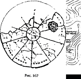 Три элемента этого «города-календаря» имеют круглую форму. Самый маленький из них – это каменный диск, разделенный на десять секторов (рис. 167), в который вставлены по кругу маленькие камешки. Всего маленьких камешков шестьдесят, по шесть на каждый сектор. Вторая круглая структура, которую иногда называют «маленьким круглым святилищем», состоит из образующих правильную окружность камней, тщательно и одинаково обработанных: одиннадцать групп по восемь камней, одна группа из семи и одна из шести камней. Тринадцать более широких и иначе обработанных камней как бы отделяют остальные группы. Внутри крута должны были существовать и другие столбы или колонны, предназначенные для наблюдений и вычислений, однако точное их расположение указать невозможно. В некоторых работах, например в «2 Templo-Calendario Dacio di Sarmizegutusa» Адриана Диаковичиу, высказывается предположение, что эта структура представляет собой лунно-солнечный календарь, который использовался для различных вычислений и предсказаний, в том числе и для выравнивания лунного и солнечного года посредством периодического добавления тринадцатого месяца. Это обстоятельство, а также повсеместное присутствие числа шестьдесят, которое было основой шумерской шестидесятеричной системы счисления, заставили ученых искать связи с Месопотамией. «Это сходство, – писал А. Диаковичиу, – не может быть ни совпадением, ни случайностью». Археологические и этнографические исследования этой области указывают на то, что в начале второго тысячелетия до нашей эры в этот регион, населенный примитивными земледельческими племенами, пришла цивилизация бронзового века, принеся с собой кочевое скотоводство и более сложное общественное устройство. И время, и особенности этих перемен подходят для беженцев из Шумера.