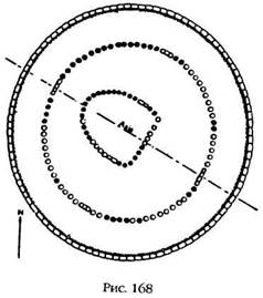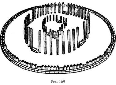 И последнее, совершенно очевидное сходство со Стоунхенджем – это внутренняя «подкова». Она состоит из двадцати одной лунки, расположенных в форме эллипса и разделенных двумя горизонтальными камнями по обе стороны от перемычки из тринадцати камней, которая обращена на юго-восток и не оставляет сомнений в том, что главной точкой наблюдений была точка зимнего солнцестояния Солнца. А. Диаковичиу, для простоты визуализации исключив некоторые деревянные столбы, предложил возможную схему древнего «храма» (рис. 169). Каждый из деревянных шестов был покрыт «оболочкой» из терракоты, но Сербан Бонакчу и другие исследователи из Национальной академии Румынии заметили, что все они в основании имели массивный блок из известняка, и этот факт, вне всякого сомнения, доказывает, что древние строители рассчитывали, что сооружение простоит века и даже тысячелетия.