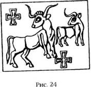 В минойских мифах и легендах большое место занимает легенда о минотавре. Это чудовище с туловищем человека и головой быка родила от быка жена царя Миноса Пасифая. Археологические находки подтвердили, что культ быка получил широкое распространение в эпоху минойской цивилизации, а на некоторых цилиндрических печатях бык изображается как божество – рядом с символом в виде креста, который обозначал какую-то из планет. Этот факт дает основания предположить, что древние критяне поклонялись не обычному, а небесному быку, то есть созвездию Тельца, – в честь неких событий, произошедших в эпоху примерно в 4000 году до нашей эры, когда в день весеннего равноденствия солнце всходило именно в этом созвездии (рис. 24).