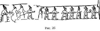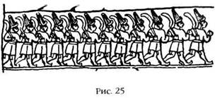 Слева начиналась длинная процессия мужских божеств, явно разделенная на группы по двенадцать фигур. Крайними слева, то есть последними в этом удивительном параде, располагались двенадцать идентичных фигур с одинаковым оружием в руках (рис. 25).