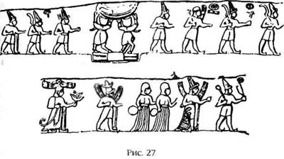 Средняя группа из двенадцати идущих фигур включала в себя нескольких богов, которые выглядели старше остальных. Другие держали в руках различное оружие, а рядом с двумя из них были вырезаны божественные символы (рис. 26).
