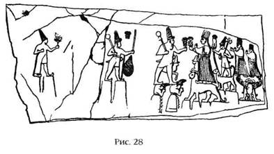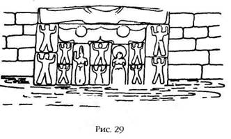Тот факт, что основой пантеона хеттских богов служило «священное число» двенадцать, подтверждается еще одним памятником, сложенным из кирпичей храмом, который был найден неподалеку от современного города Бейт-Зехир. В нем найдено изображение божественной четы в окружении еще десяти богов – всего двенадцать фигур (рис. 29).