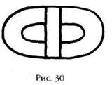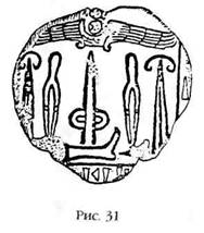 Археологические находки убедительно доказали, что боги, которым поклонялись хетты, были богами «неба и земли», связанными между собой и образовывавшими строгую генеалогическую иерархию. Часть из них относилась к великим и «старым» богам, изначально населявшим небеса. Их символ – эта хеттская пиктограмма переводится как «божественный» или «небесный бог» – напоминает два глаза (рис. 30). Он часто встречается на цилиндрических печатях как часть похожего на ракету объекта (рис. 31).