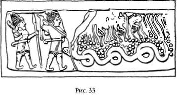 Легенды хеттов – еще одно сходство с греческими мифами – повествуют о том, что их главному богу пришлось сражаться с чудовищем, чтобы утвердить свое главенство на земле. В тексте, который ученые назвали «Миф о повер-жении дракона», противником Тешуба был бог Янка. Не сумев победить его в битве, Тешуб обращается за помощью к другим богам, но на его сторону встала лишь одна богиня. Она помогла расправиться с Янки, напоив его на пиру. Признавая, что подобные мифы являются основой легенды о святом Георгии и драконе, ученые идентифицируют противника, убитого «хорошим богом», как «дракона». Однако на самом деле Янка переводится как «змея», и древние народы изображали «злых» богов именно в виде змей, что наглядно иллюстрируется одним из хеттских барельефов (рис. 33).